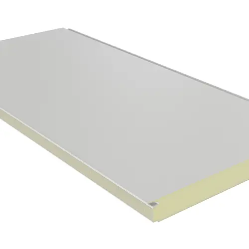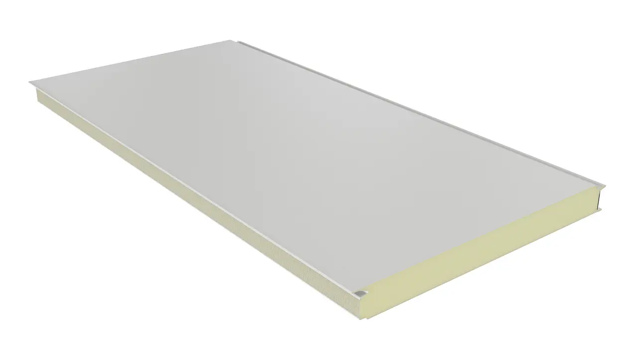 A panel magja poliizocianurát (PIR) hab, amely a kiváló hőszigetelés mellett (λ ~0,024 W/m·K) fokozott tűzbiztonságot is nyújt (B-s2,d0 osztály – nem terjeszti a lángot).